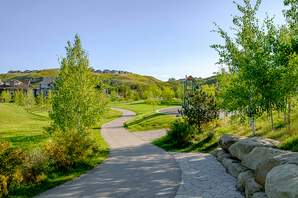 Thanks to unprecedented access to the Bow River, one of Quarry Park's distinctive features is over 90 acres of parks and pathways that connect throughout the community. The design is part of a strategic plan to reduce vehicular congestion and to be bicycle and pedestrian friendly. At Quarry Park, residents who live and work in the community can walk or cycle to work. Punctuating the development's focus on natural spaces is a 50 acre environmental reserve connected to the community and Calgary's renowned pathway system.